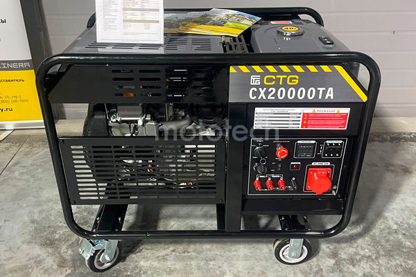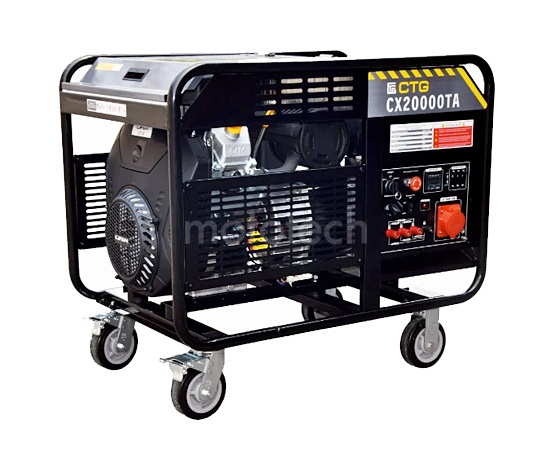 Трехфазный портативный бензогенератор CTG CX20000TA, резервной мощностью 21.2 кВА. Генератор оснащен электронной панелью с цифровым дисплеем. Тип запуска - ручной / электростартер. Объем топливного бака 40 л. В комплекте стальная опорная рама, тележечный комплект, наличие разъема для подключения внешнего ATS.