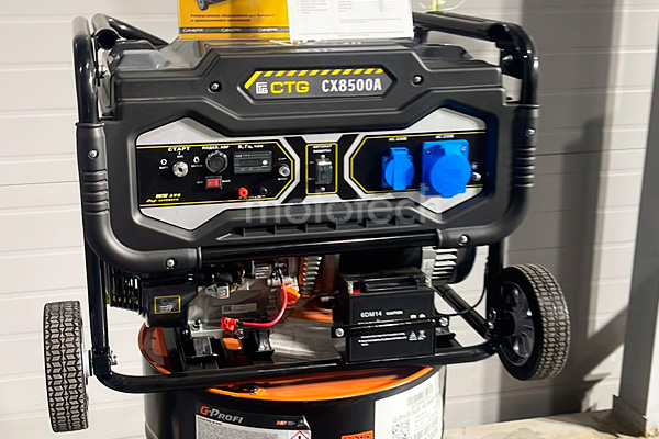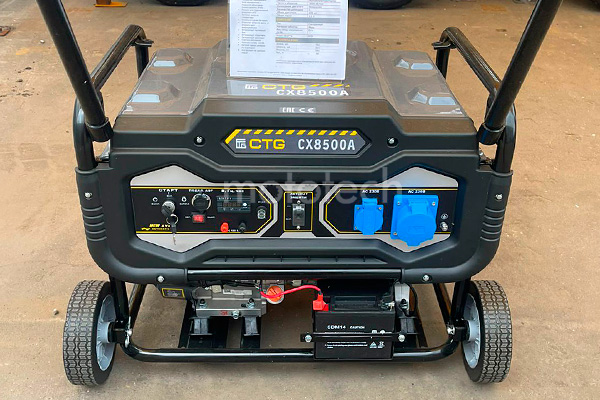 Однофазный портативный бензогенератор CTG CX8500A, резервной мощностью 7.5 кВА. Генератор оснащен электронной панелью с цифровым дисплеем. Тип запуска - ручной / электростартер. Объем топливного бака 25 л. В комплекте стальная опорная рама, тележечный комплект, наличие разъема для подключения внешнего ATS.